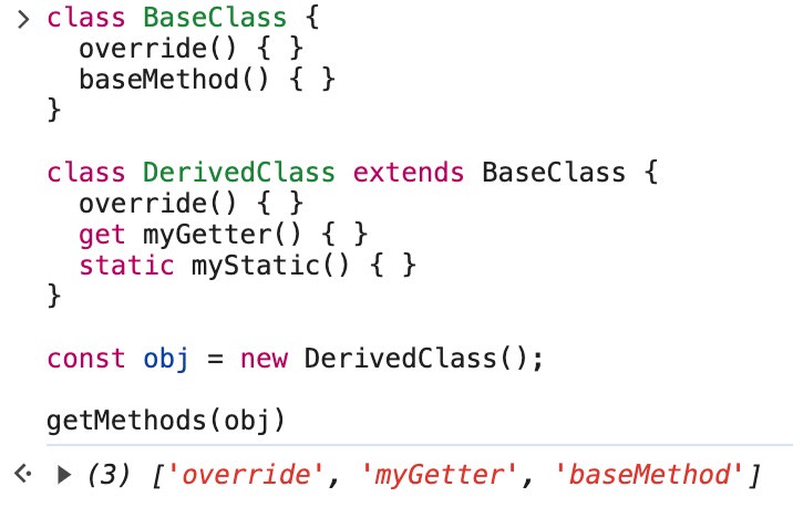 const getMethods = (obj) => distinctDeepFunctions(obj).filter(name => name !== "constructor" && !~name.indexOf("__"))